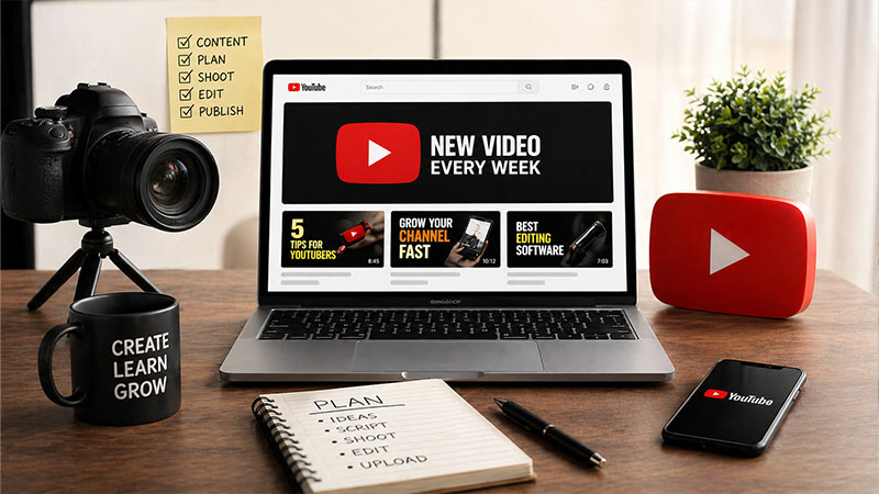 Professional YouTube workspace setup with laptop, camera, smartphone and content planning notebook for starting a YouTube channel in 2026